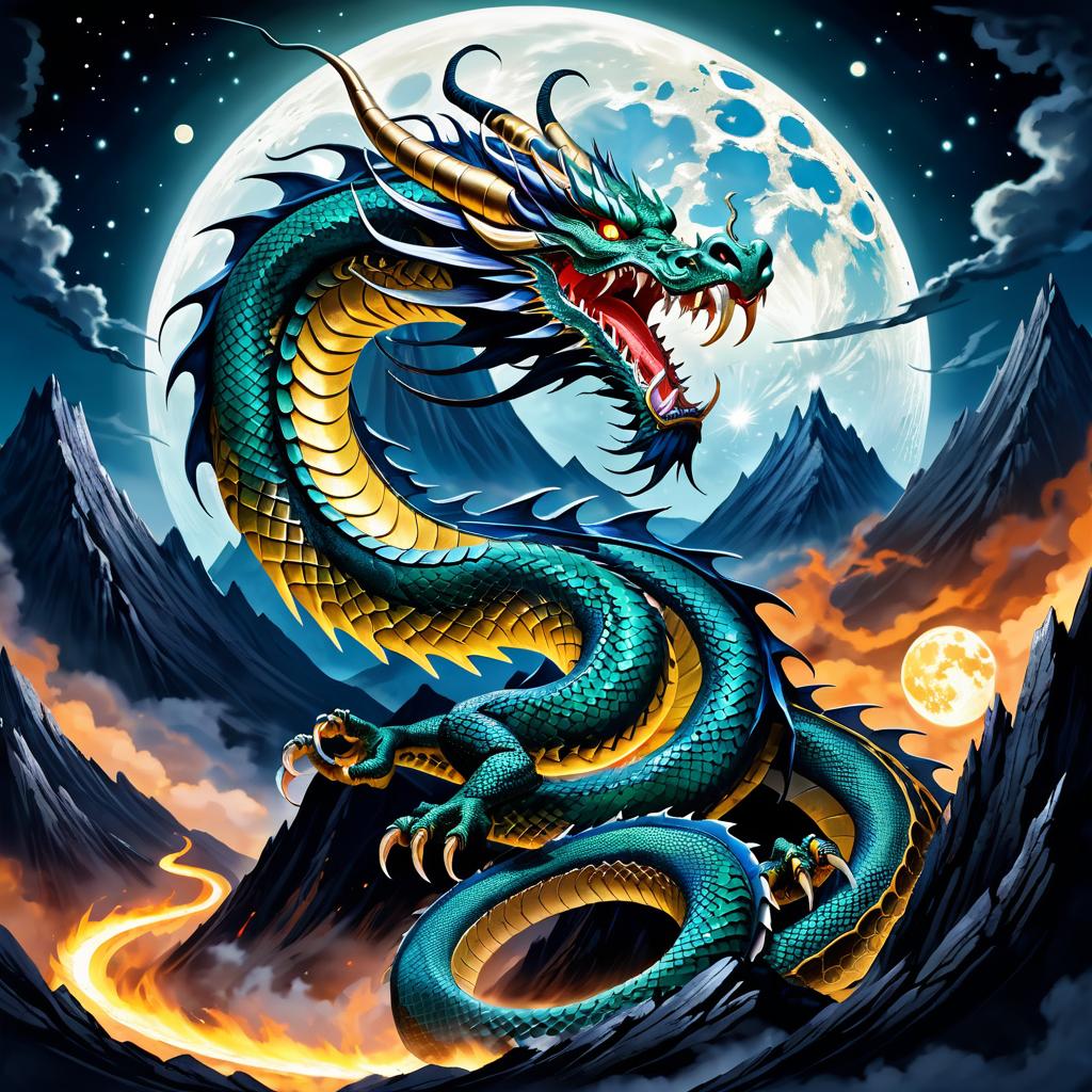Bakunawa – Serpent dragon who tries to devour the moon, depicted as an enormous dragon twisting menacingly, radiating mystical energy, set in a desolate mountain range beneath a full moon illuminating the dark terrain.