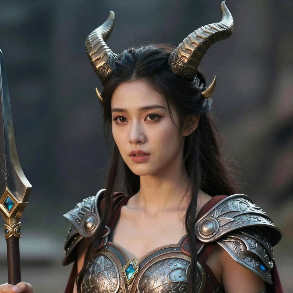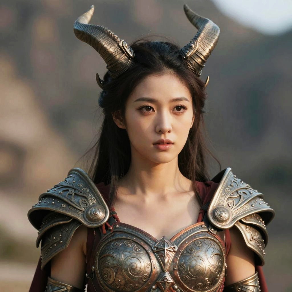 Goddess nyx costume, a close up of a woman in armor with horns on her head