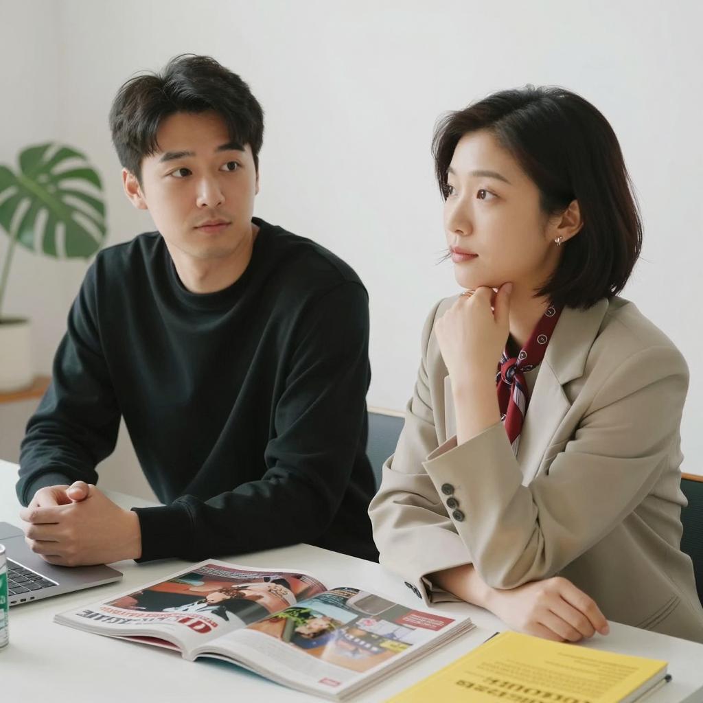 Three young adults sitting at a diner table having a meal together. A man with dark hair wearing a brown jacket smiles while facing a woman with short black hair in a white shirt with red patterns. Another man with dark hair smokes a cigarette. Plates of food and glasses of water are on the table. Background shows a kitchen counter with warm yellow-toned lighting. The setting is casual and cozy.