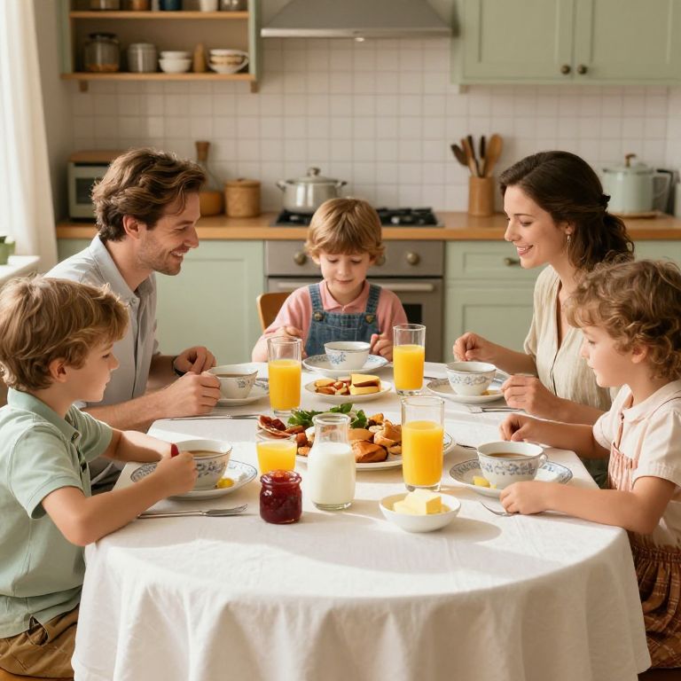 Photograph of a cheerful family of five seated around a white-clothed round table in a sunlit kitchen. The father, with brown hair and a beard, wears a light blue shirt; the mother, with dark brown hair in a ponytail, wears a cream blouse. Their three sons, with blond and brown hair, are dressed in casual shirts. The table is adorned with plates, glasses of orange juice, and jars of jam. The background features light green cabinets, a stainless steel range hood, and a white tiled backsplash. All family members are smiling and engaged in a meal together.
