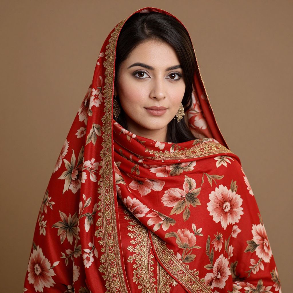 Young woman wearing a vibrant red floral silk scarf draped elegantly over her shoulders and head, complementing her traditional attire with intricate gold embroidery along the edges.