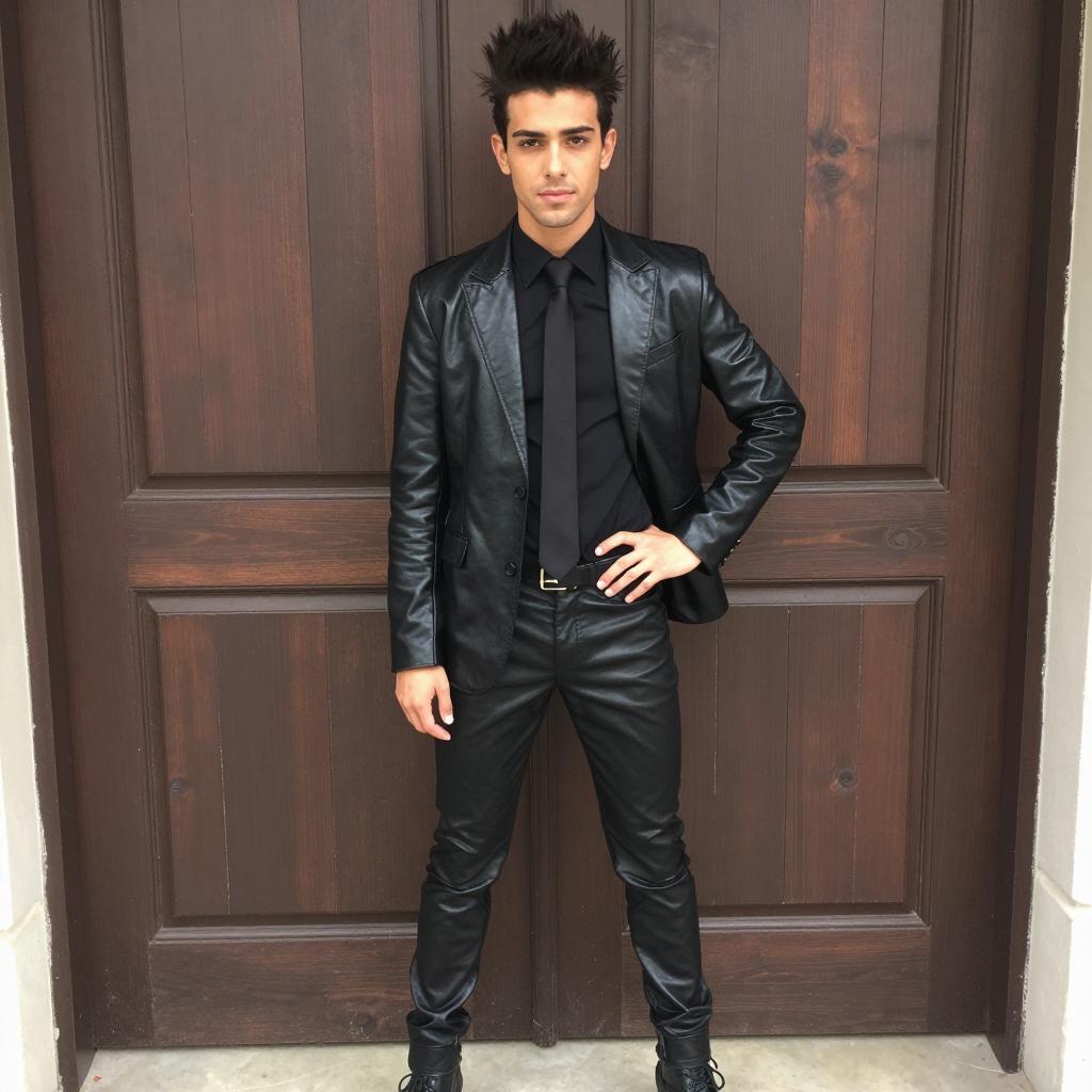 Portrait of a young man with dark spiky hair wearing an all-black leather suit, black shirt, and black tie. He is standing in front of a brown wooden door with one hand on his hip, exuding confidence. The image is captured in natural lighting with a medium shot and realistic style.
