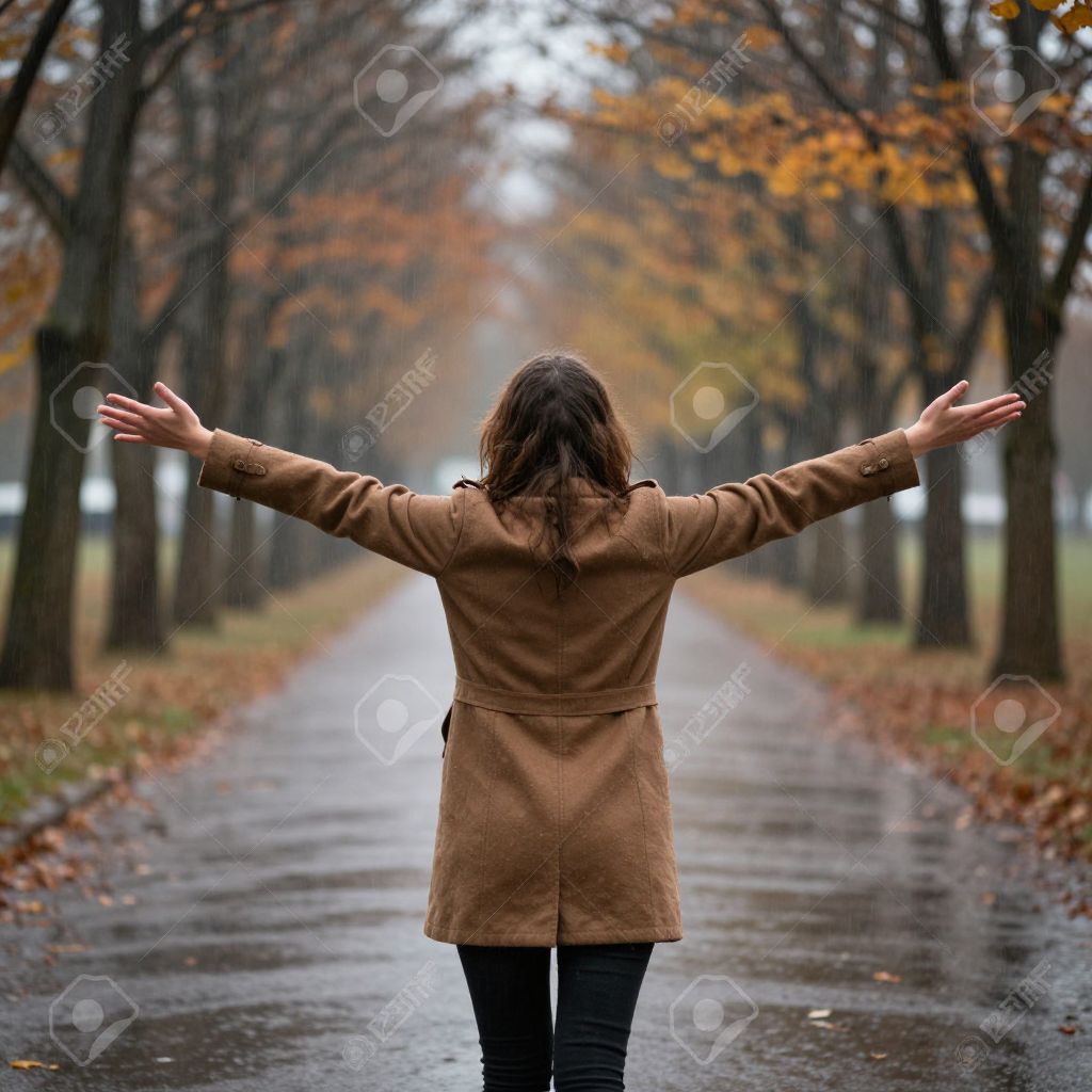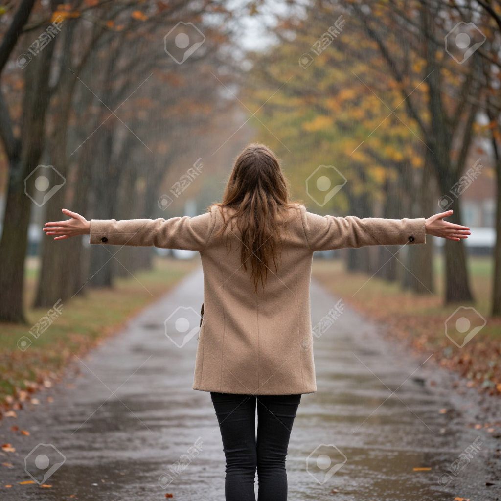 Photograph of a woman with long brown hair standing on a wet, tree-lined path during autumn. She faces away from the camera, arms outstretched in a gesture of freedom or openness. She wears a brown coat with black pants. The path, lined with trees with orange and yellow leaves, stretches into the distance, becoming increasingly blurred. The overcast sky adds a moody, reflective ambiance. Water droplets on the path suggest recent rain. The image has a soft focus, emphasizing the woman's centered, expansive stance amidst the natural, symmetrical setting.