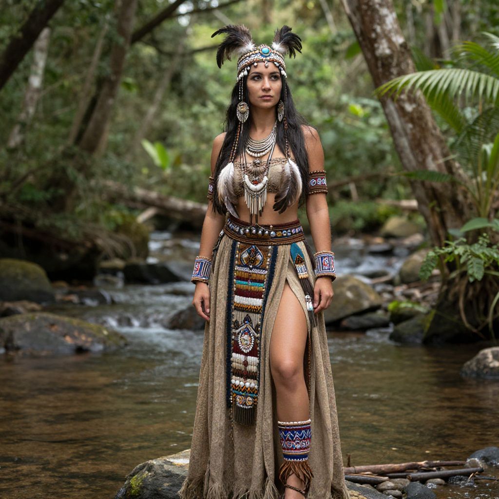 Photograph of a young woman standing in a lush, tropical forest by a flowing stream. She has long black hair adorned with a feathered headdress and wears an intricate, traditional tribal outfit. Her outfit includes a beaded and metallic breastplate, arm bands, and a high-slit skirt with colorful beadwork. She has a bronze skin tone and a focused expression. The background features green foliage, trees, and rocks, with sunlight filtering through the leaves. The overall style is vibrant and detailed, emphasizing the cultural and natural elements.