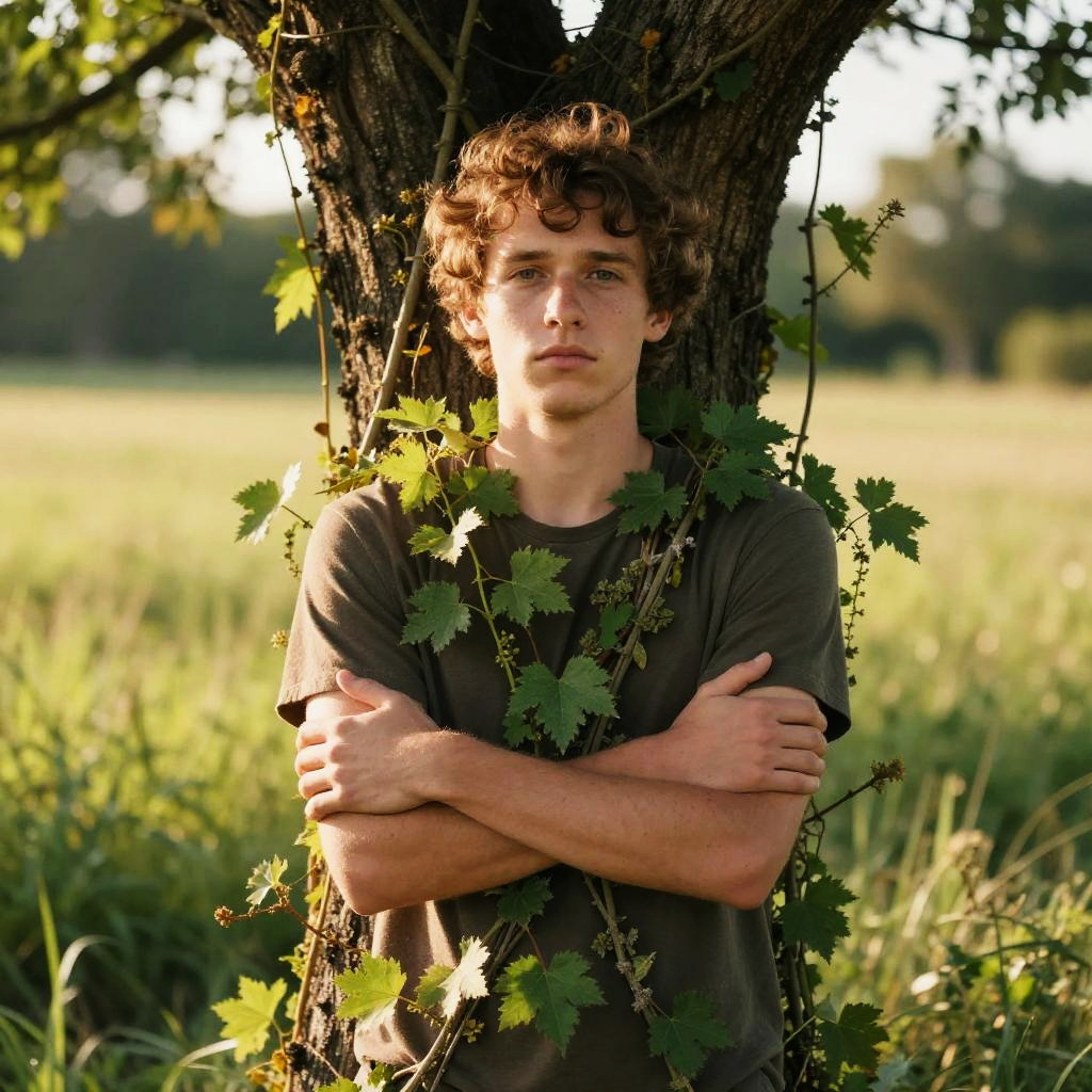 Man tied to tree in a sunlit clearing, wild vines wrapped around him, subtle facial details, vibrant foliage, photorealistic, soft golden hour lighting --v 5 --ar 3:2