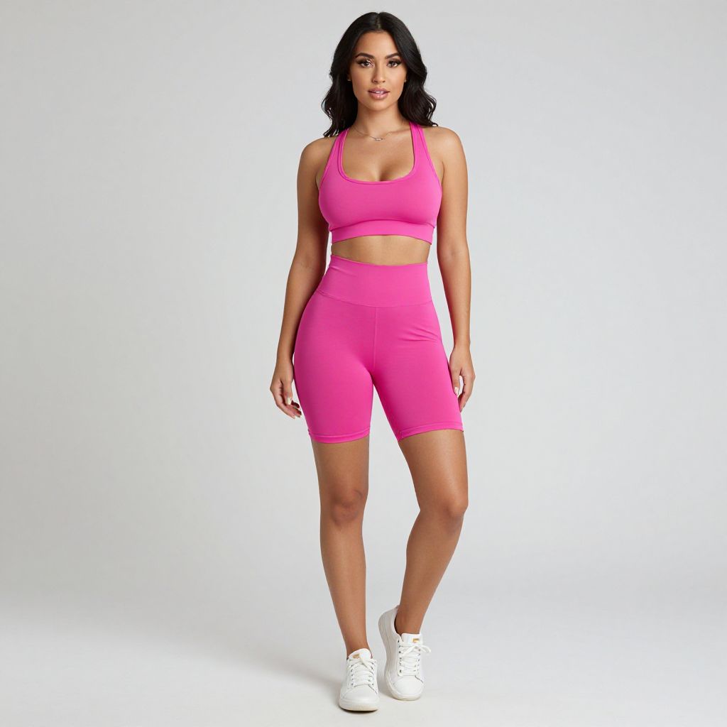 "Woman, sporty chic, hot pink crop top, scoop neck, racerback, matching high-waisted bike shorts, mid-thigh length, white lace-up sneakers, plain white background.. Sexy. Pretty face and beаutiful eyes. Big breasts."