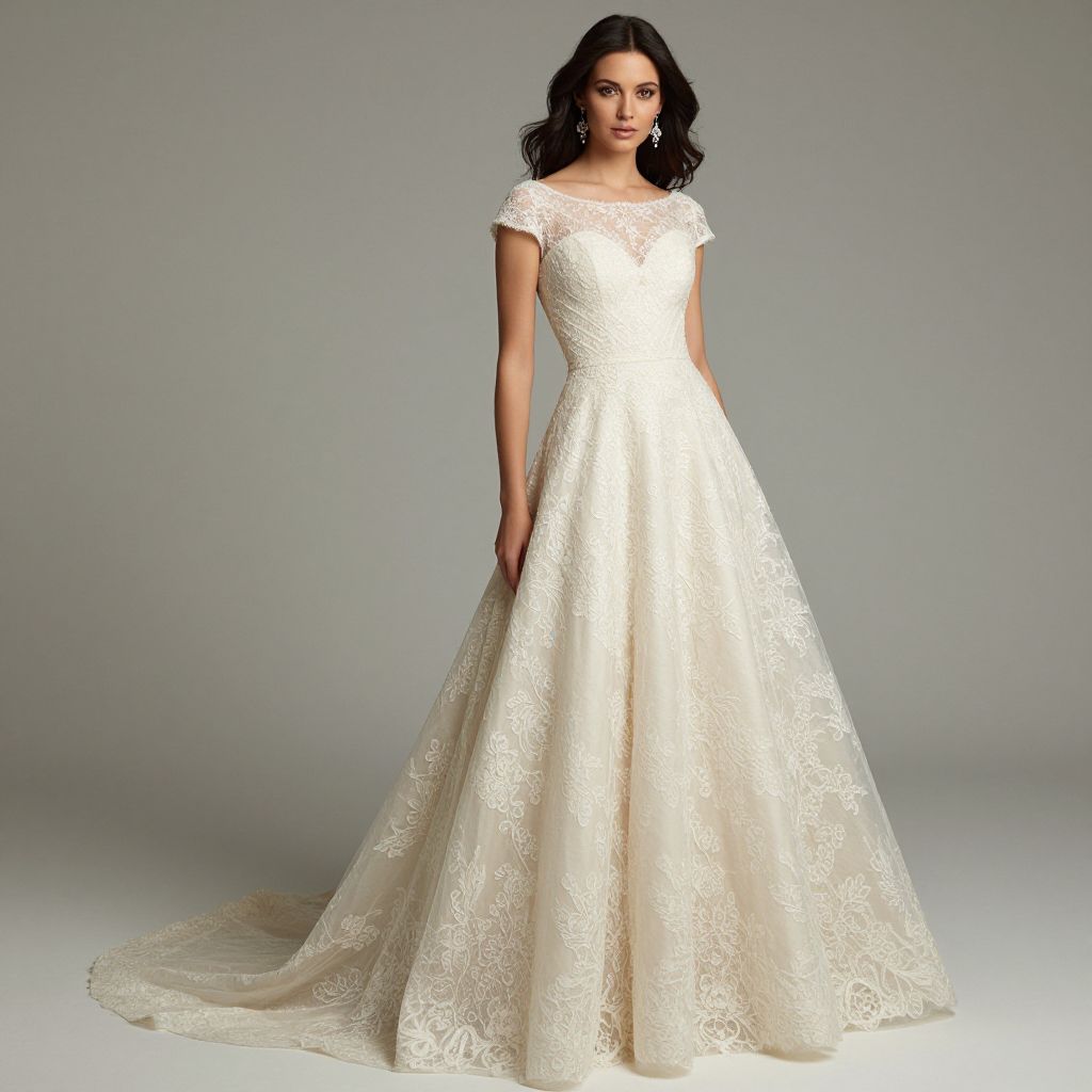 Elegant creamy lace scoop-neck wedding gown featuring delicate cap sleeves and a flowing tulle skirt, gracefully worn by a woman with cascading dark hair and sparkling earrings against a neutral backdrop.