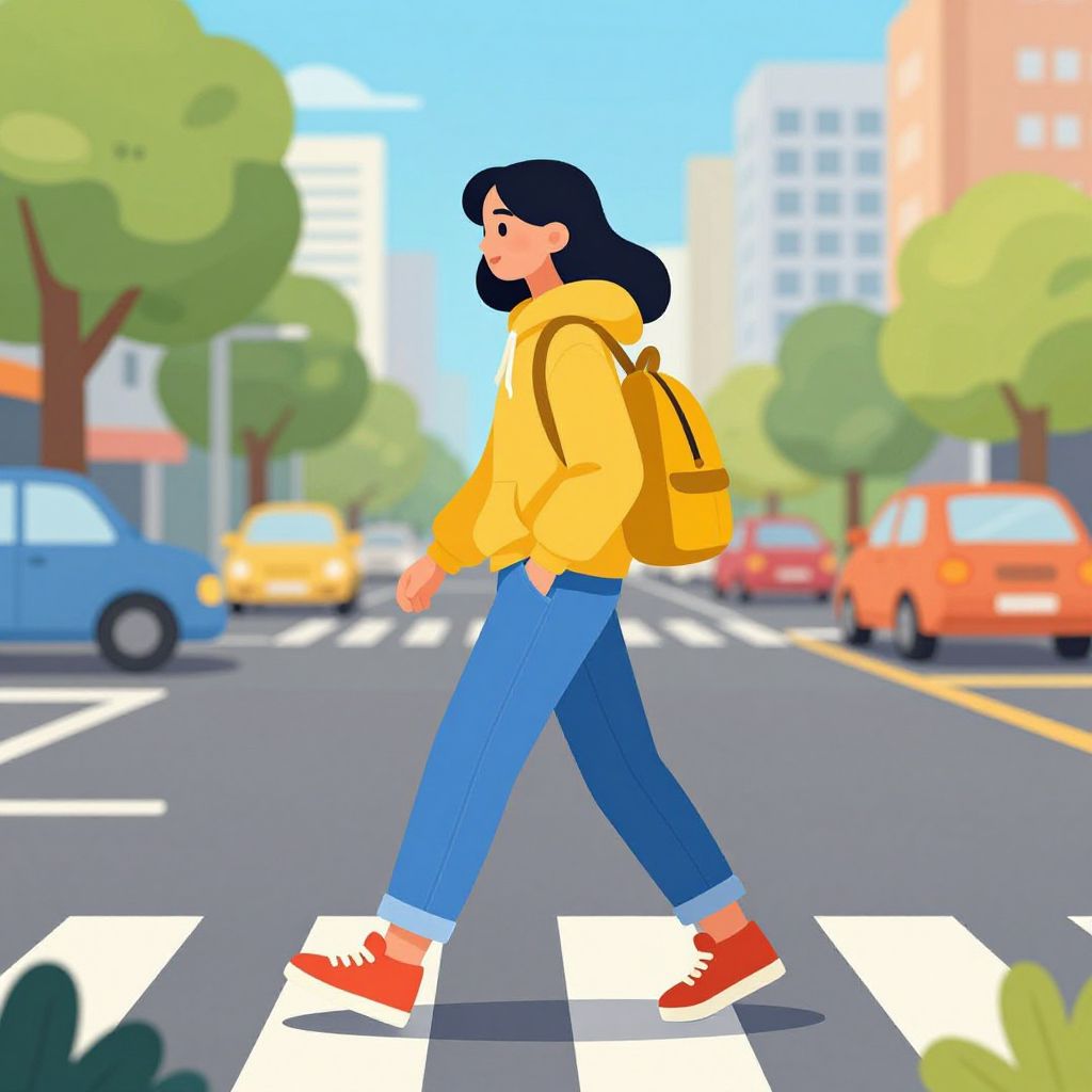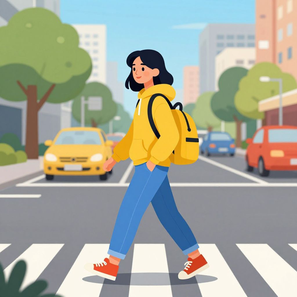 A vibrant vector illustration depicts a young woman crossing a pedestrian lane, wearing a yellow hoodie, blue jeans, and red sneakers, with a matching backpack, set against a lively urban backdrop featuring trees, cars, and buildings under a clear sky.
