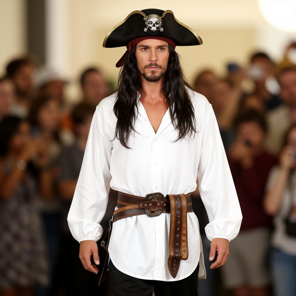 "White Pirate Costume Dress, pirate in white shirt and black hat standing in front of a crowd"