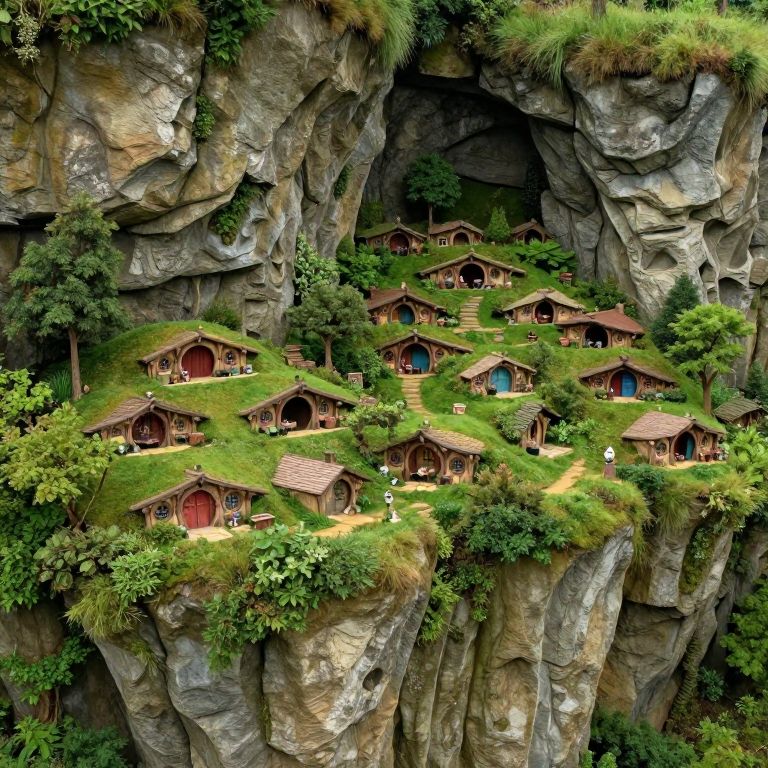 The image presents a meticulously crafted miniature village, carved into the side of an alien-like canyon. The village is composed of numerous tiny hobbit houses, each intricately designed with curved roofs and round windows, reminiscent of the homes from J.R.R. Tolkien's Middle-earth. The houses are nestled among lush greenery, with tiny trees and bushes growing directly from the earth, adding a touch of nature to the otherwise artificial structures. The village is hyper-detailed, with small objects and furniture visible within the houses, suggesting a bustling community. The canyon walls are rough and textured, with moss and other vegetation clinging to their surfaces, enhancing the sense of an organic, natural environment. The overall composition is balanced, with the village spread out along the canyon's edge, creating a harmonious blend of man-made and natural elements.