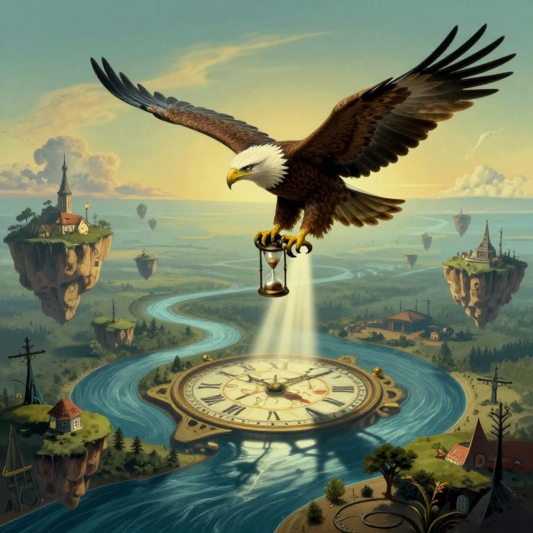 Create an image in the surrealistic style that echoes Dali-esque dreamscapes, depicting a bird's-eye view of a fantastical landscape where time flows like rivers between floating isles. In this ethereal realm, a regal eagle gracefully glides, its wings unfurled as it clutches a vintage bronze hourglass in its talons. Beams of light pierce through the distorted, melding components of an intricate clockwork, casting enchanting shadows that pirouette across the otherworldly expanse below, invoking a profound sense of awe and contemplation on the nature of time itself.