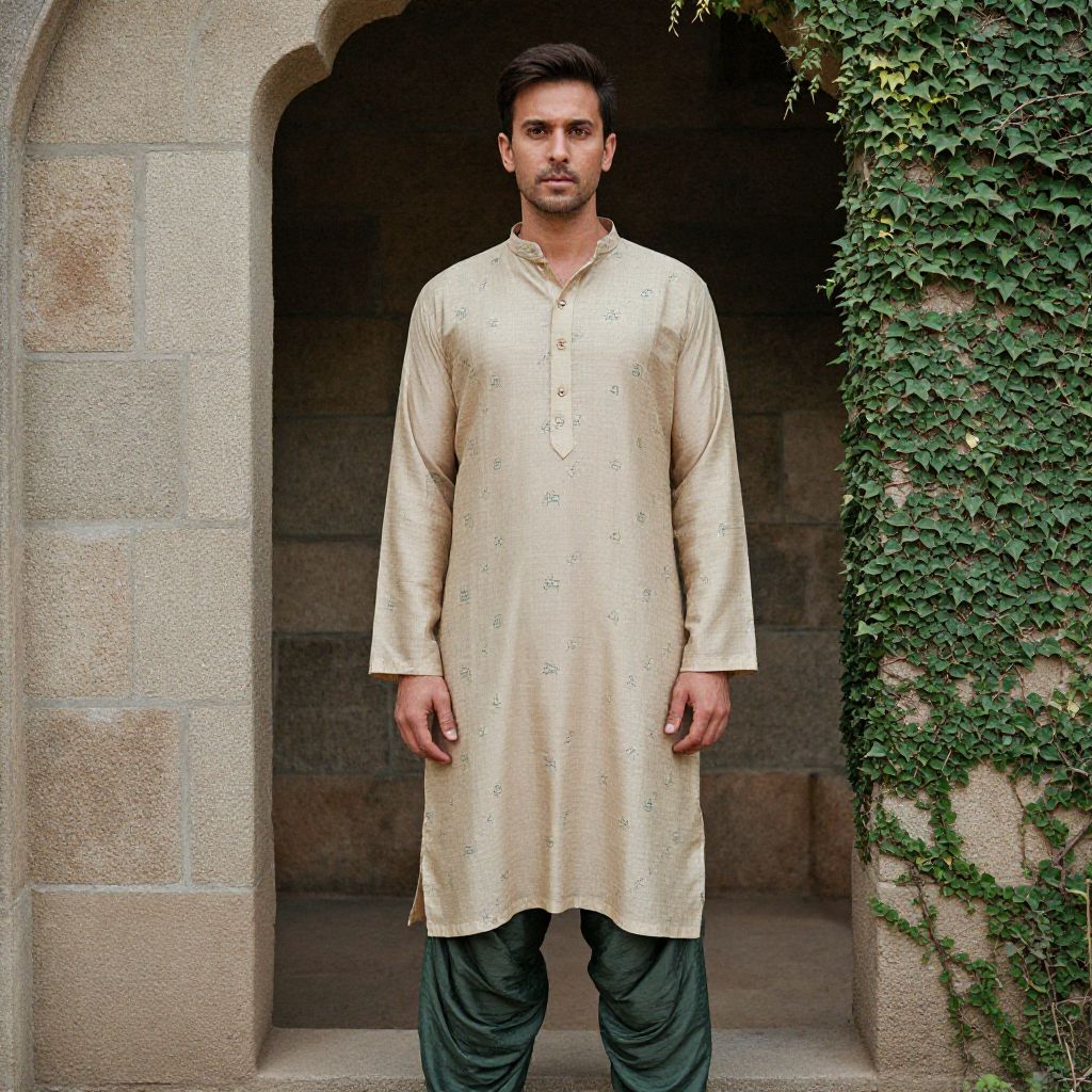 Photograph of a young South Asian man standing in front of a stone archway adorned with climbing ivy. He has short, dark hair and a trimmed beard, and is wearing a beige, long-sleeved, embroidered kameez with a button-down front, paired with dark green pants. The stone archway has a textured, light brown surface, and the ivy adds a touch of greenery. The man stands centered, looking directly at the camera with a neutral expression. The setting suggests a traditional or historical location.