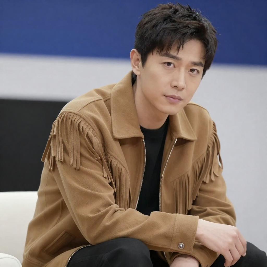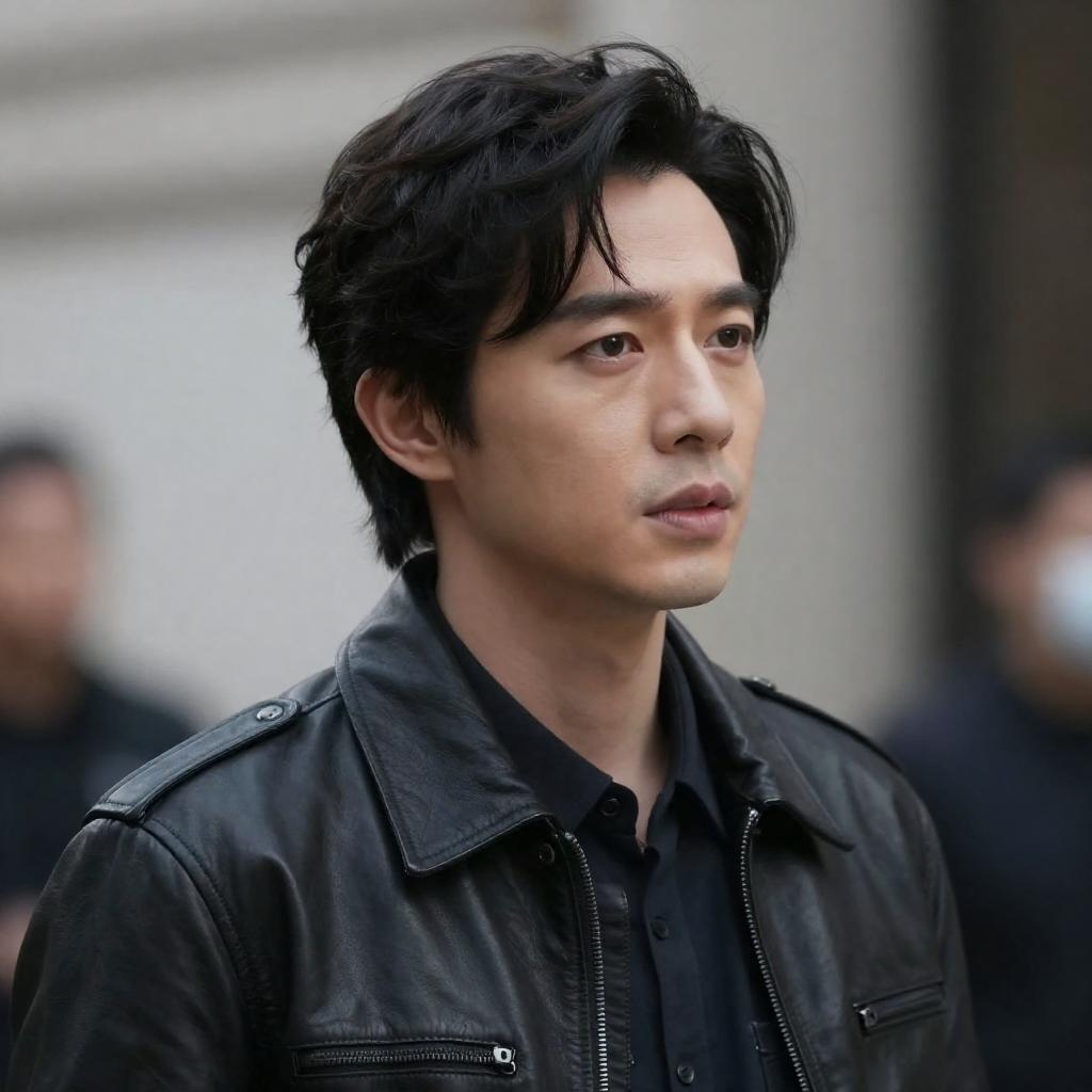 Photograph of a medium-close shot of a man with dark, wavy hair and light skin, wearing a black leather jacket over a dark shirt. He has a serious expression, slightly parted lips, and is looking to the right. The background is blurred, emphasizing his face.