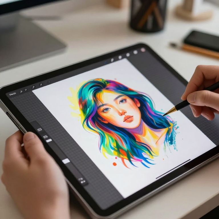 Inpainting tutorial showing a digital artist's workspace, close-up on a tablet with a partially restored image, vibrant color palette, soft lighting, step-by-step visual guide style, modern creative studio background, detailed brush strokes and interface icons.