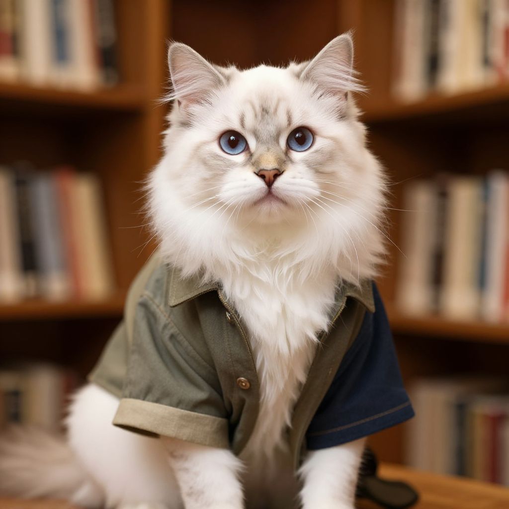 Photograph of a fluffy, white, long-haired cat with striking blue eyes, wearing a green, short-sleeved, button-up shirt. The cat has a serious expression and is centered in the image. The background features a blurred wooden bookshelf filled with various books, creating a cozy, library-like atmosphere. The cat's fur is soft and voluminous, contrasting with the slightly worn texture of the shirt. The lighting is warm, highlighting the cat's fur and eyes, making them stand out against the darker background.