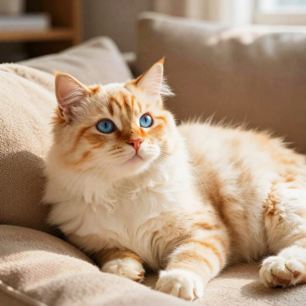 Furry cat human with fluffy white fur and subtle stripes, expressive blue eyes, dressed in casual modern clothes, sitting in a cozy library with books and warm lighting