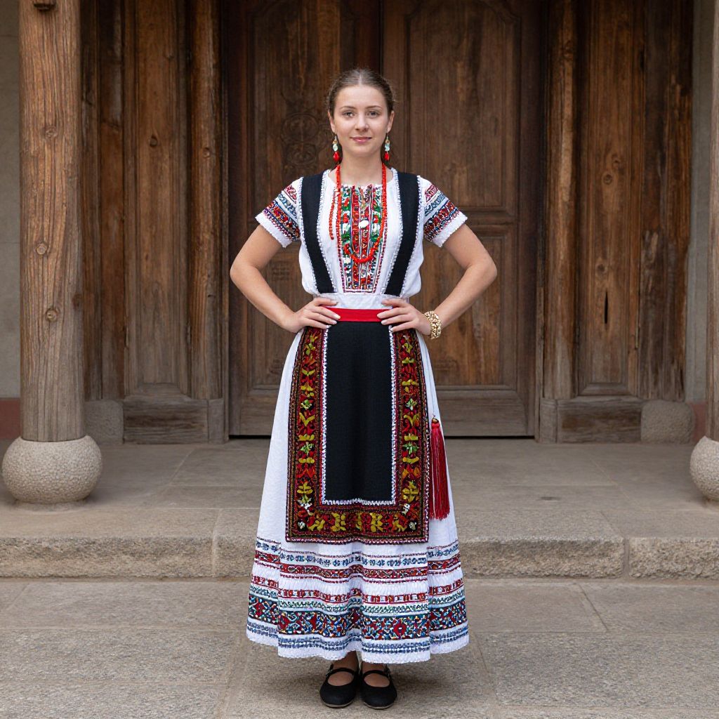 "Traditional Folk Dress, woman in a traditional dress poses for a picture"
