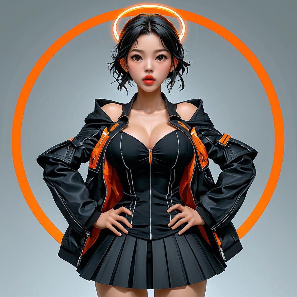This digital CGI image features an attractive Asian woman with fair skin and black, wavy hair styled in a bob. She wears a black, form-fitting, cleavage-revealing top with orange accents and a pleated mini skirt. Her black jacket is open, exposing her top and shoulders. She stands confidently with hands on hips, set against a gradient gray background with a glowing orange circular halo behind her head. Her red lips and intense gaze add a bold contrast to the image. The style is hyper-realistic with a slight anime influence, emphasizing her flawless skin and exaggerated facial features.