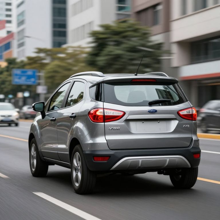 Photograph of a silver Ford Escape SUV driving on a city street. The car is viewed from the rear, showcasing its sleek design, red tail lights, and "Ford" emblem on the hatch. The background includes blurred buildings with large windows and a mix of green trees and urban signage. The road has white lane markings, and other vehicles are visible in the distance. The SUV's windows are slightly tinted, and its tires are black with chrome rims. The overall scene suggests a busy urban environment.