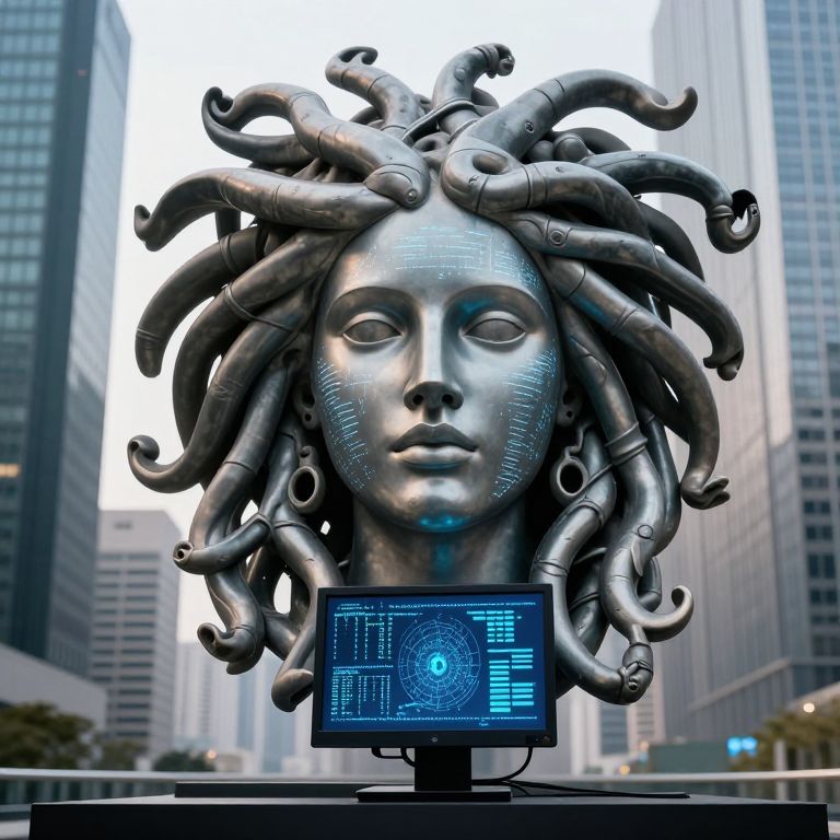 A futuristic sculpture of Medusa with a digital face and a computer monitor displaying occult code, set against a modern cityscape.