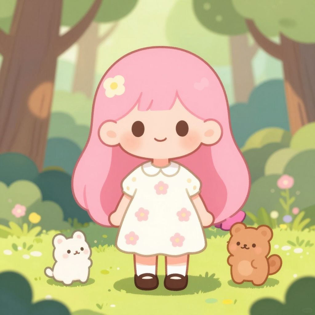 Cartoon girl with pink hair, whimsical forest setting, pastel color palette, cute animal companions, wearing a floral dress, afternoon sunlight filtering through trees