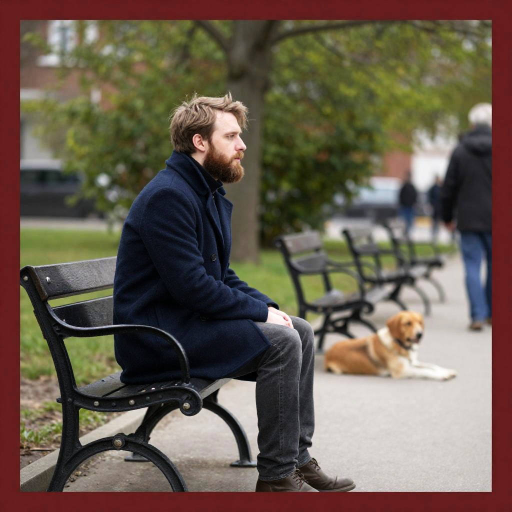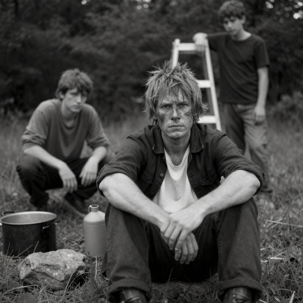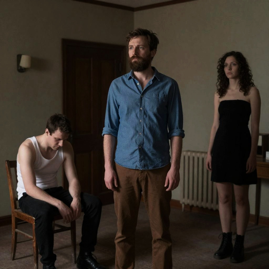Photograph of a man with a beard and messy hair, looking through a dirty, broken window. He has a worried expression. He is inside a dimly lit, old brick building with a rough, cracked wall. The window has four panes.