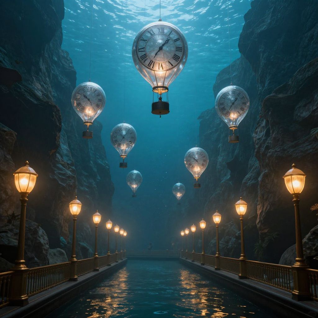Photograph of a mystical underwater scene featuring a narrow, stone-walled canal. Seven floating, illuminated hot air balloons with clock faces hang from the blue, water-filled ceiling. Warm yellow street lamps line both sides of the canal, their reflections shimmering on the wet pavement. The rocky, textured walls frame the pathway, creating an enchanting, surreal atmosphere. The overall color palette includes deep blues, warm yellows, and the soft glow of the lamps. The image combines elements of fantasy and reality, evoking a sense of magical wonder.
