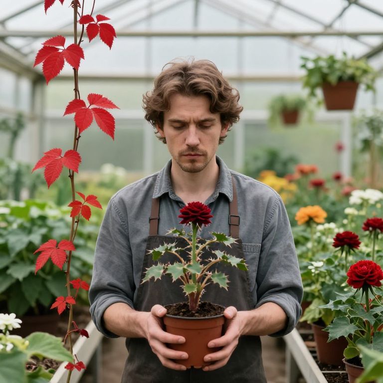 Photograph of a Caucasian man with wavy brown hair and a light beard, standing in a greenhouse. He wears a gray denim shirt with brown suspenders over a dark apron. He holds a small brown pot with a dark red, spiky-leaved plant in both hands. The background is filled with various flowering plants, including red and white blooms, and a tall plant with bright red leaves on the left. The greenhouse has a glass and metal frame, with soft natural light filtering through. The man's expression is focused and slightly concerned.