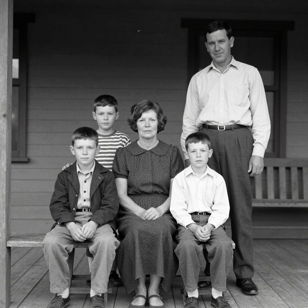 This black-and-white photograph shows a family of five sitting on a wooden porch. The mother, with short hair and wearing a dark dress, sits in the middle. To her right, the father, in a light shirt and dark pants, stands. Two boys, one in a striped shirt and the other in a light shirt, sit on either side of her. A younger boy with a jacket sits to her left. The background is a wooden wall. The image has a vintage, slightly worn look with visible scratches.