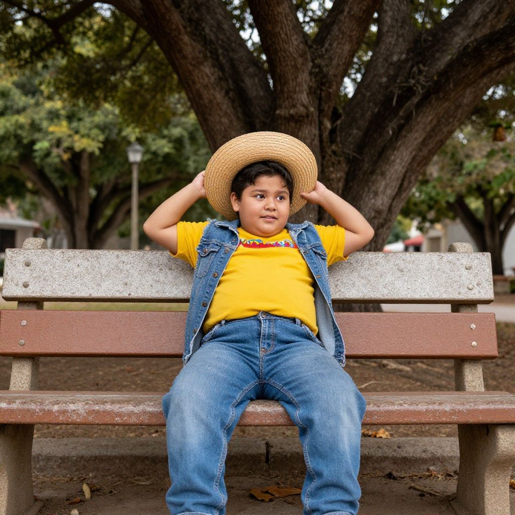 Obese Mexican kid sitting on a park bench under a large tree, wearing a straw hat, colorful clothing, playful and relaxed vibe, intricate nature details, warm lighting