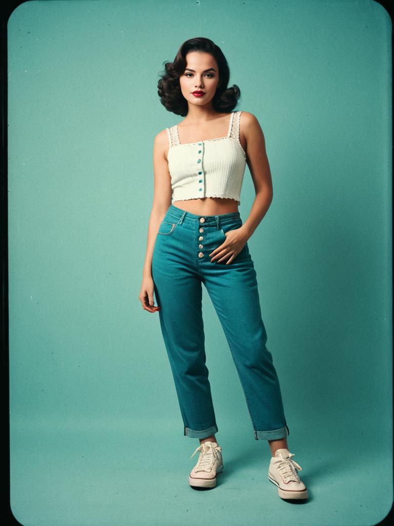 Full-body portrait of a young woman with pink hair wearing a pink Lady Marmalade costume. The outfit includes a light pink cap, a white crop top with orange graphics, pink satin shorts, white socks, and pink sneakers. She stands against a plain gray wall with one hand on her hip, exhibiting a confident pose.
