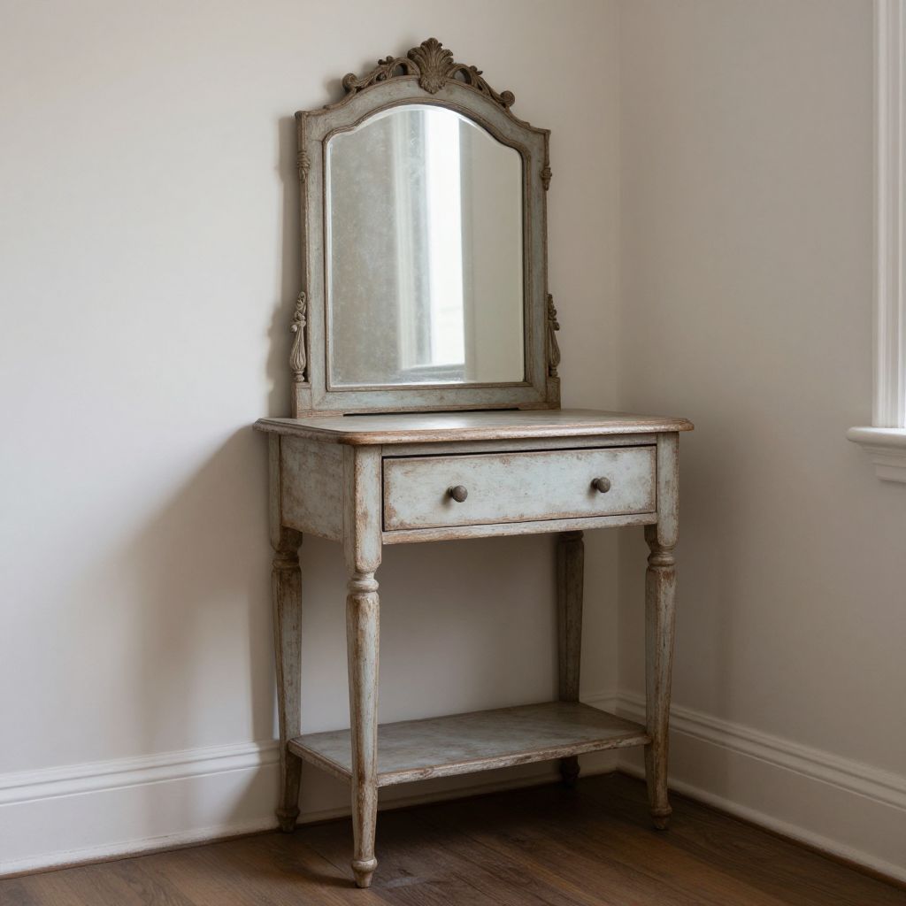 Vintage wooden vanity with ornate mirror, weathered white finish, two small drawers, and a lower shelf, positioned in a corner.