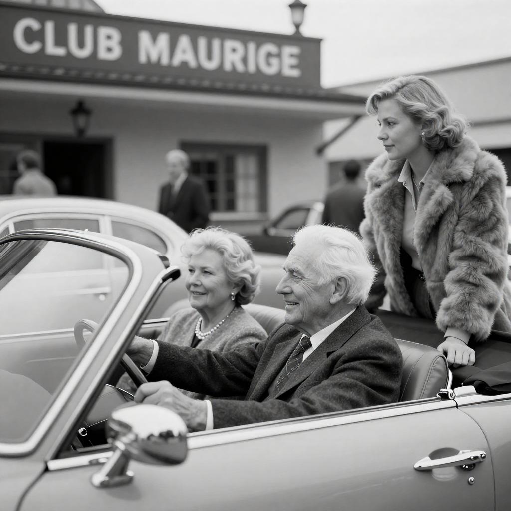 Black-and-white photograph. Elderly man with white hair driving convertible, smiling at elderly woman with short blonde hair in passenger seat. Younger woman with blonde hair and fur coat standing outside, looking at them. Classic car, 1950s-style building with "CLUB MAURICE" sign in background. Cars and people in background.