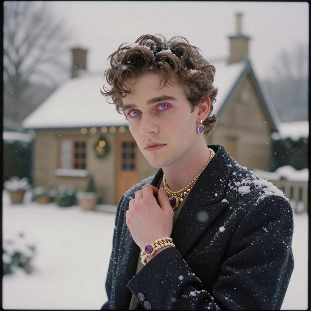 A beautiful festive cabin in the English countryside on Christmas Eve during a snowstorm, inkpunklite768, f/1.4, square image, close up film photo, portrait of a male, magenta wavy, filmy white eyes, bone and jewel jewelry, elegant pose, atmospheric lighting, cinematic composition, detailed, summer, filmgenre__