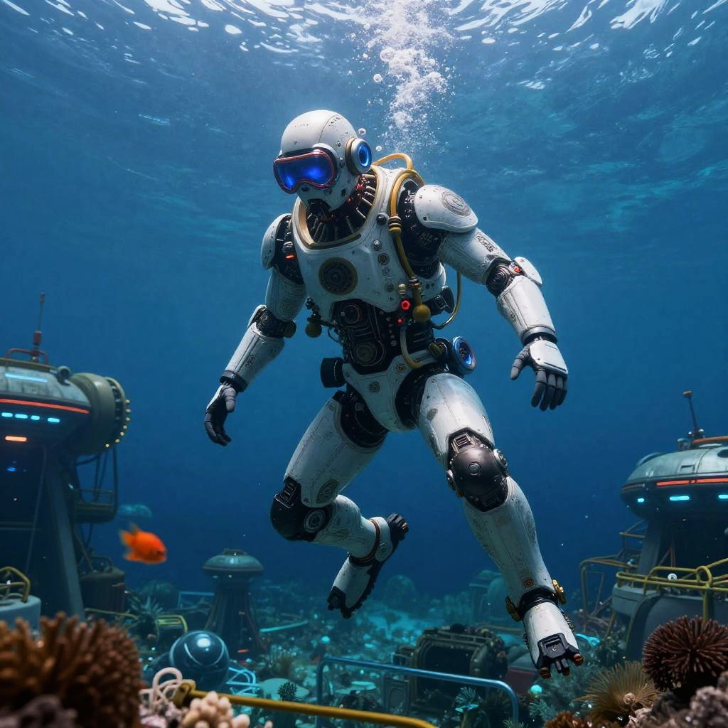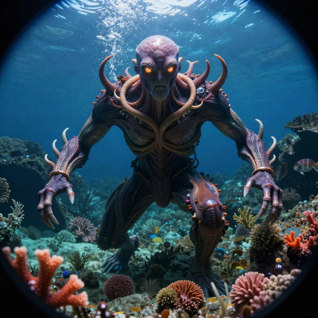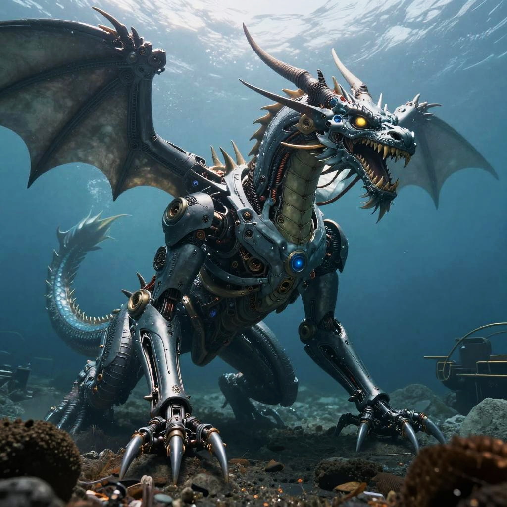 Epic underwater cyberpunk scene of a digital oceanic guardian octopus, dynamic pose, ultra-wide angle, National Geographic style, hyper-detailed with intricate color grading, shot on a 70mm lens, cinematic