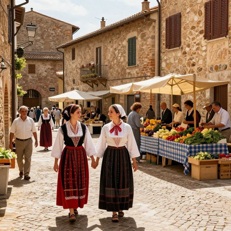 Italianas in a rustic Tuscan village market, vibrant colors, traditional clothing, sunlit cobblestone streets, fresh produce stalls, warm atmosphere, detailed textures, cinematic lighting, lively cultural scene, 4k realism