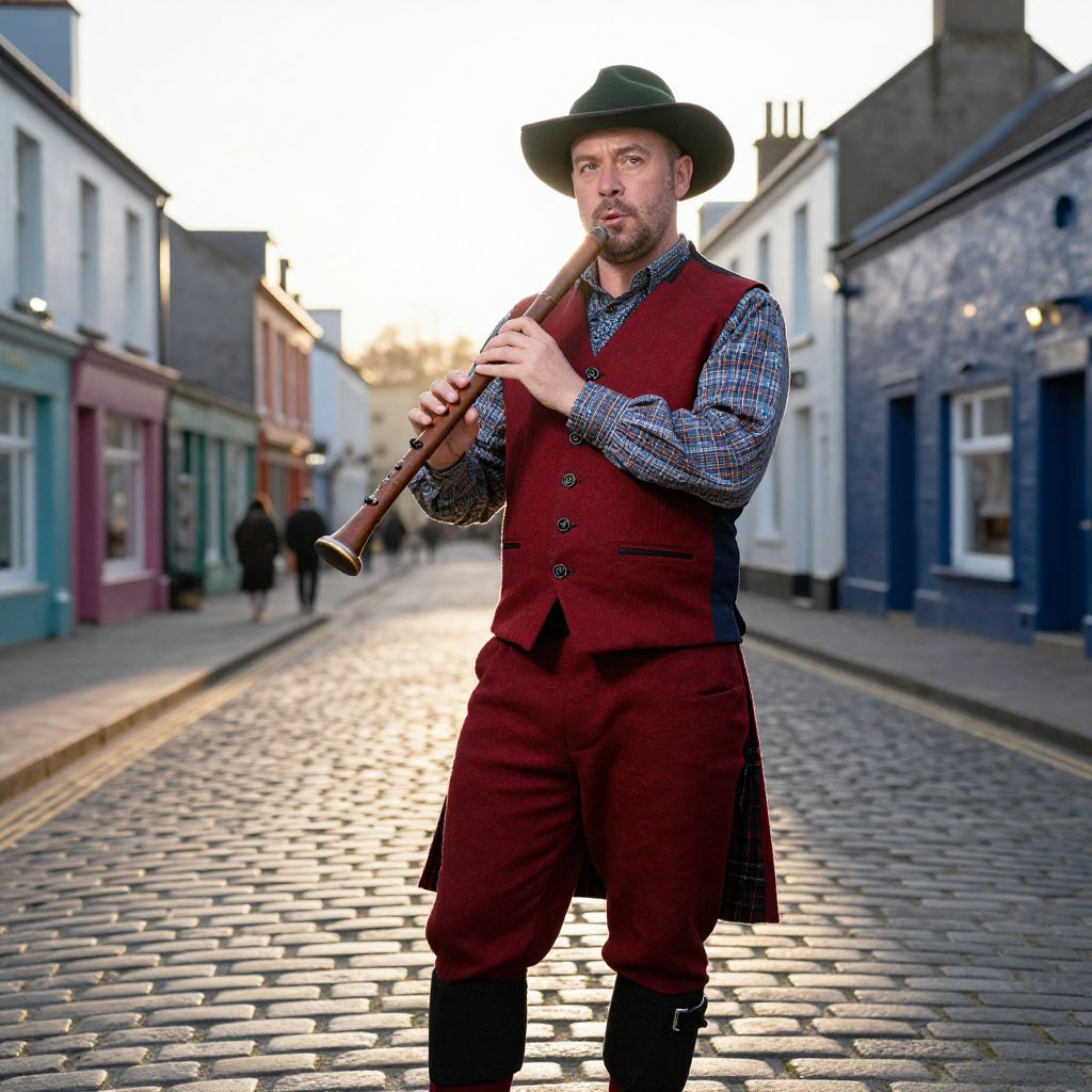 A vibrant outdoor portrait of a man in traditional Irish costume, dressed in a deep red and navy linen waistcoat, a patterned tartan shirt, a wide-brimmed green hat, and high boots, standing on a cobblestone street in a historic town in County Kerry, holding a wooden flute, with soft golden-hour lighting casting long shadows, his face has a rugged, noble look with a strong jawline and a thoughtful expression.