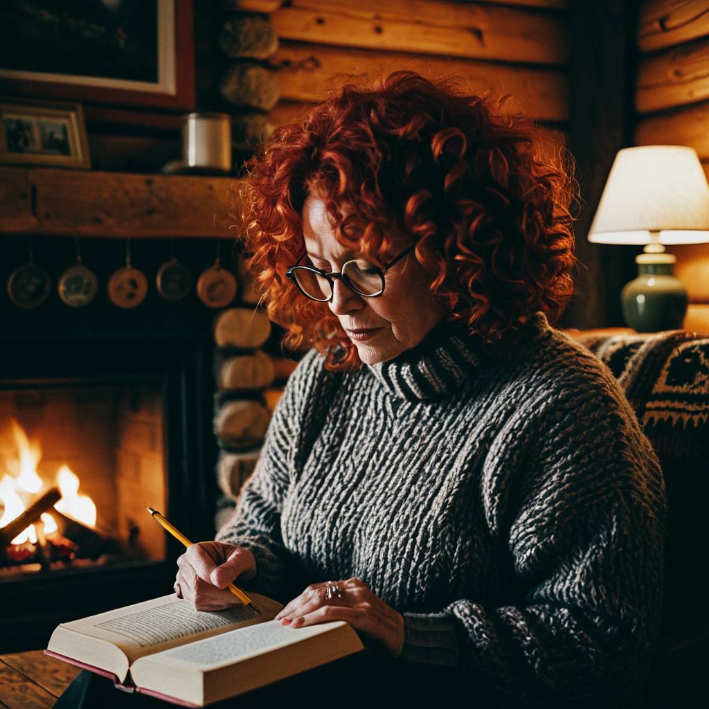 A middle-aged woman with curly red hair and round glasses is wearing a cozy knitted sweater. She is lying on a wooden floor, reading a book beside a warm fireplace inside a rustic cabin. The atmosphere is moody and inviting, with wooden walls and soft natural light coming through the window.