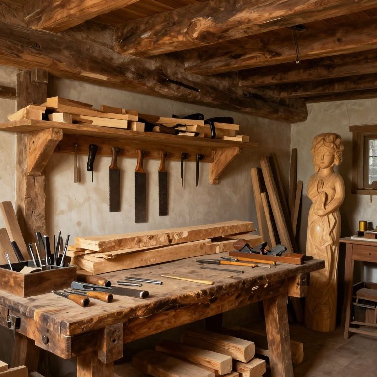 Rustic woodshop with aged wooden beams, old workbench covered in chisels, hand saws, and planes, stacks of rough cut timber, warm ambient light, a partially carved wooden sculpture in progress, charming and nostalgic atmosphere, painterly style.