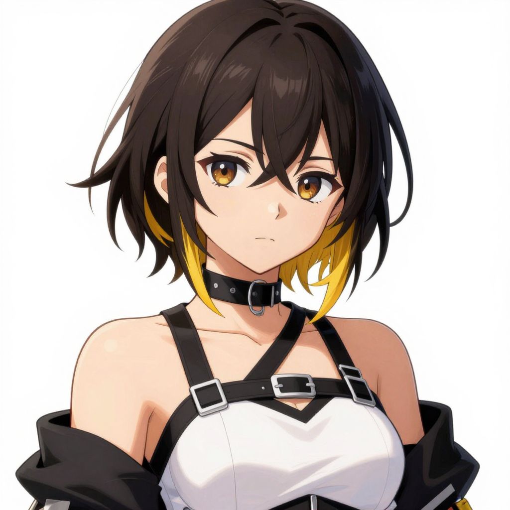 Digital anime-style portrait of a young woman with black and yellow hair, brown eyes, wearing a black choker, white harness top, and black jacket
