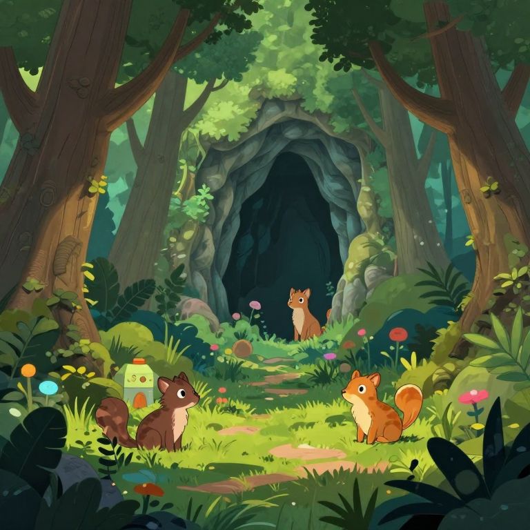 Hard Edges cartoon forest, bright, mythical, mysterious, magical cave, hidden animals, cave in background,