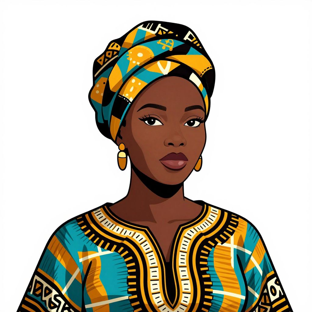 Digital illustration of a dark-skinned African woman wearing a colorful, patterned headwrap and dress with yellow, blue, and black geometric designs. She