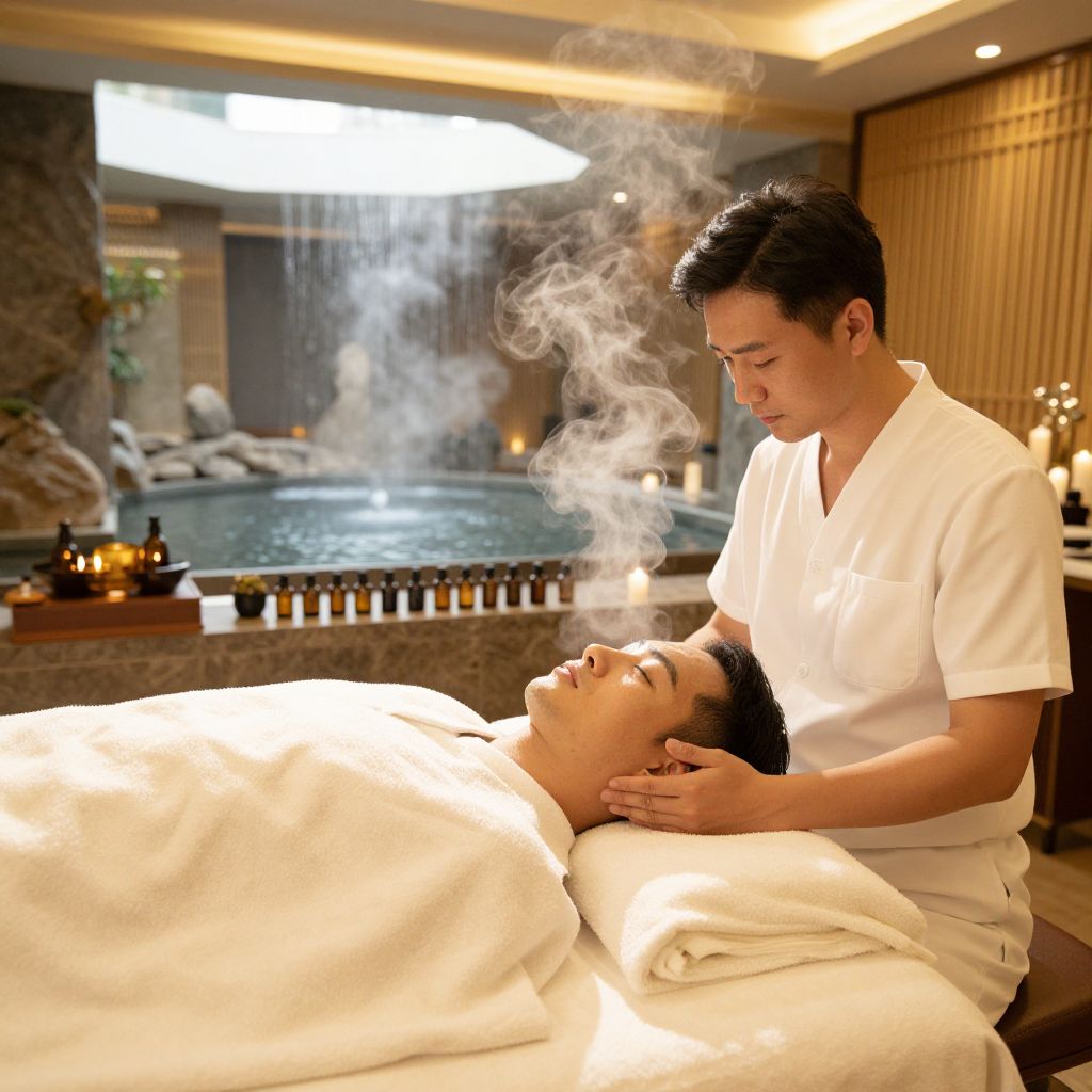 A luxurious wellness health spa treatment room with a man undergoing a facial treatment, the room filled with essential oils and soft steam, with a view of a tranquil indoor water feature in the background.
