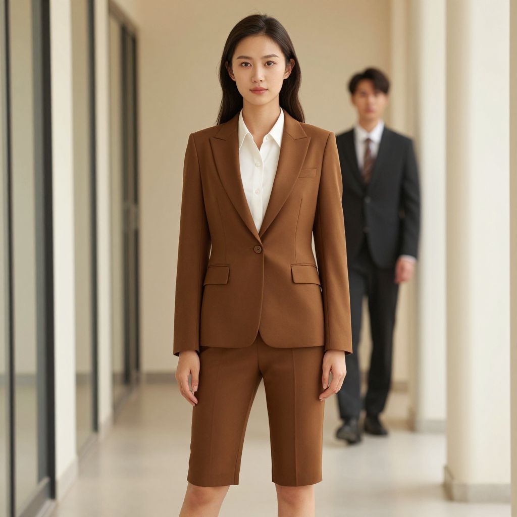 Photograph of an Asian woman in a brown suit, white shirt, standing confidently in a modern, sunlit hallway, with a blurred man in a
