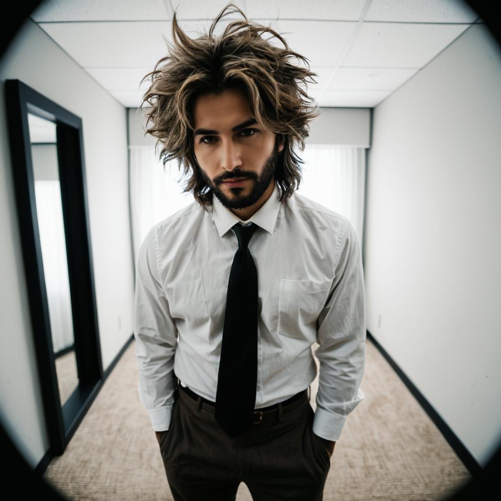 Bigby Wolf, cosplay costume, brown tousled messy hair, white dress shirt half tucked, loosely worn black tie, slight beard shadow, casual pants, studio lighting, fisheye, bokeh
