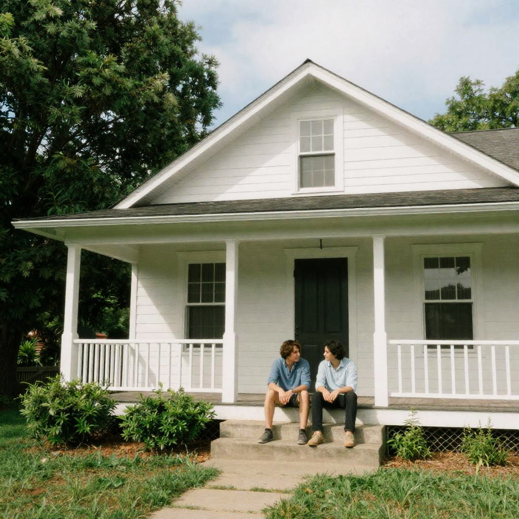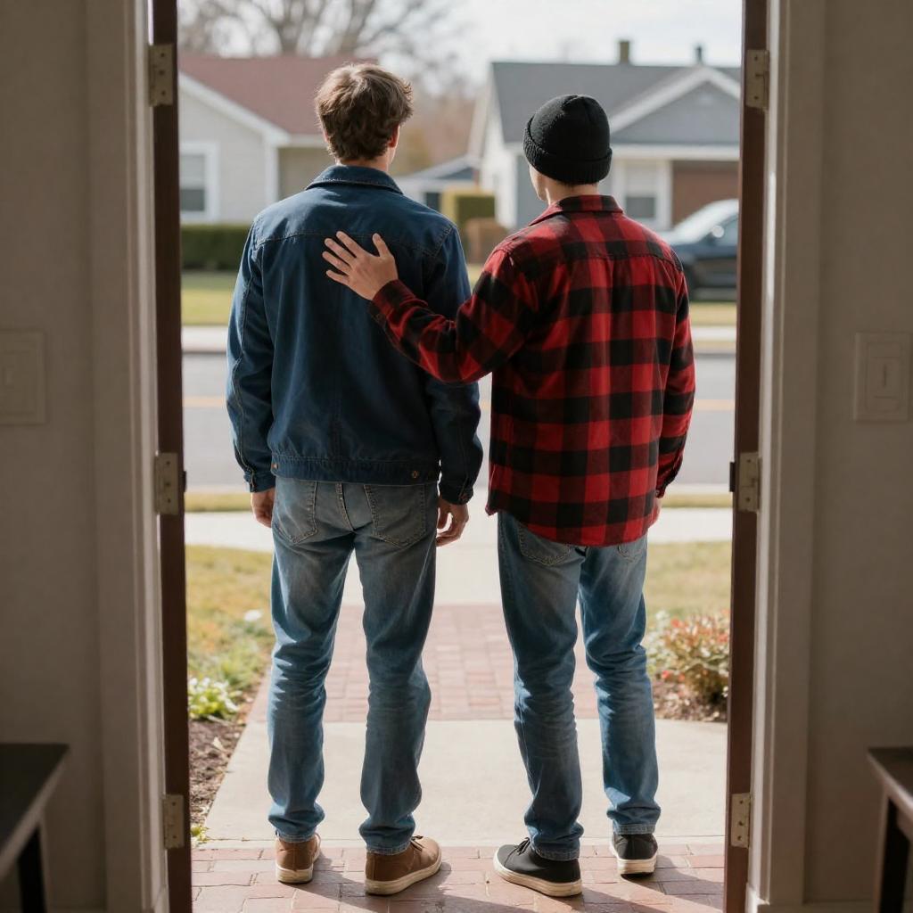 Photograph of two men standing in a doorway, facing away. The man on the left has short brown hair, wears a blue jacket and jeans. The man on the right has short black hair, wears a red and black plaid shirt, blue jeans, and a black beanie. The man on the right places his hand on the other man's shoulder. They stand on a brick pathway, with a suburban neighborhood and street in the background. Sunlight casts shadows on the ground.