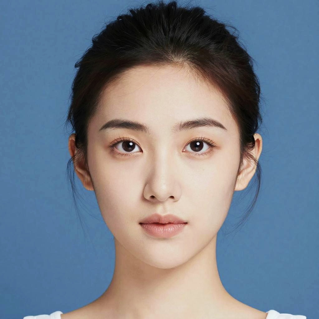 Photograph of a young Asian woman with fair skin, dark hair in a simple updo, brown eyes, and neutral expression, against a solid blue