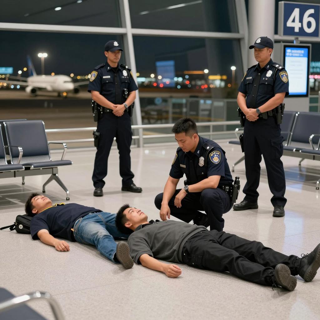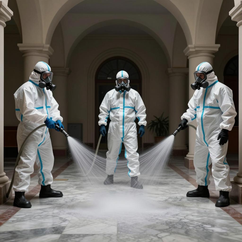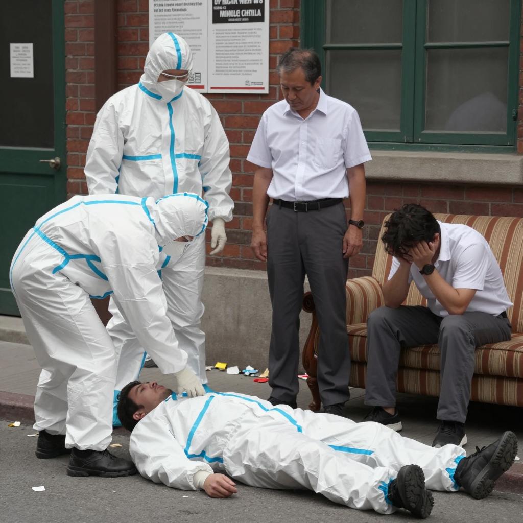 Photograph of an urban scene. Four people: one in white hazmat suit bending over a man lying on the ground, another person in similar attire, a third person in a white shirt and gray pants standing, and a fourth person with dark hair, wearing a white shirt and gray pants, sitting with head in hands. Brick wall with posters, green-framed window, and striped sofa in background. Litter and debris on ground.