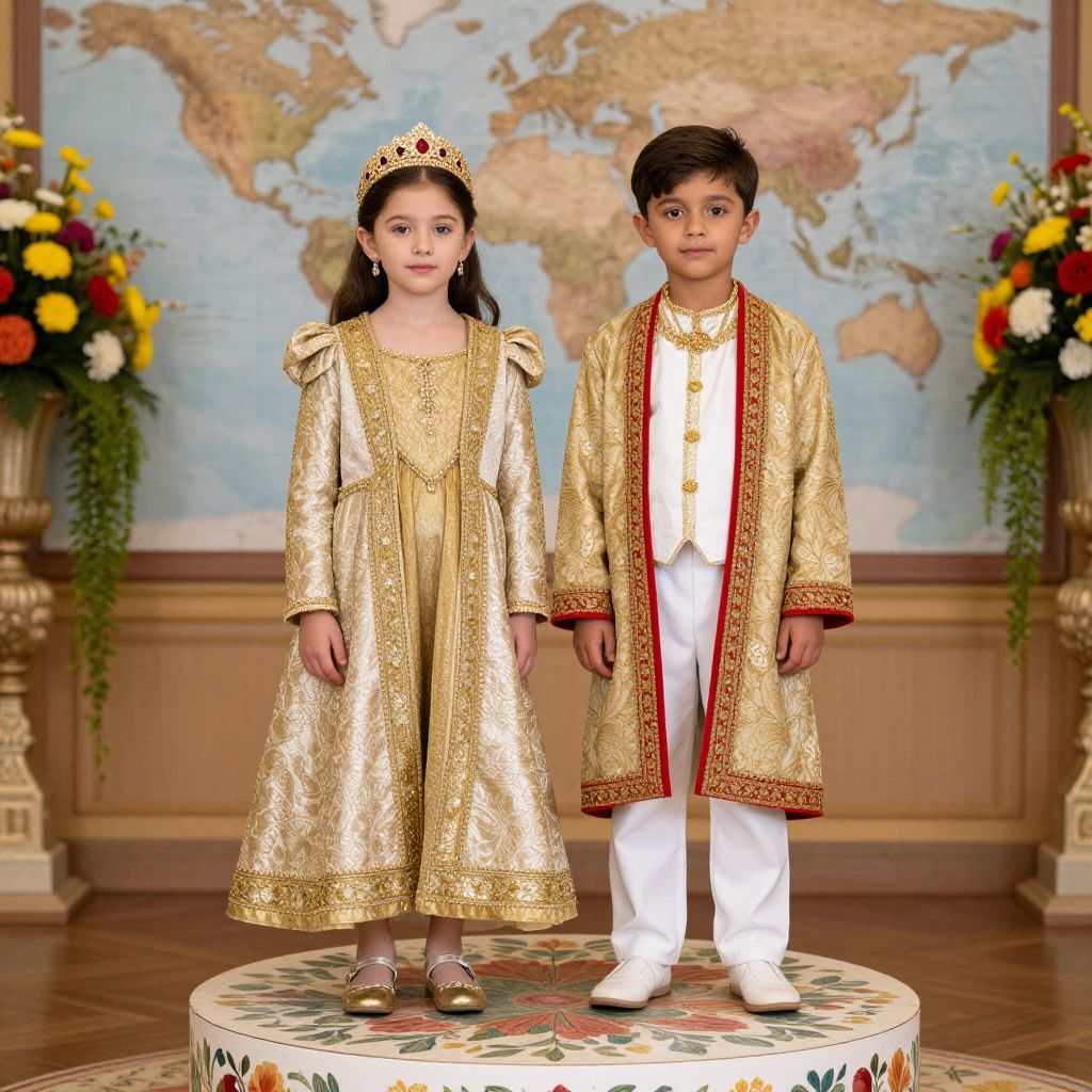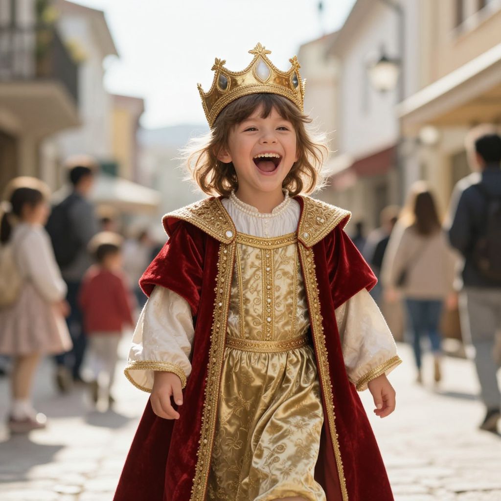 A young boy, around 8 years old, wearing a traditional royal outfit featuring intricate red and gold embroidery, with a flowing red silk tunic, golden sash, and embroidered trousers, stands proudly in front of a grand, ancient stone building with arched windows and a towering red-tiled roof. He wears a small, ornate golden crown on his head, symbolizing a royal heir, and his eyes are filled with curiosity and joy. The scene is set in a vibrant, sunlit village square, with golden sunlight casting long shadows and colorful flowers blooming around the base of the building. The atmosphere is joyful and ceremonial, capturing a moment of cultural pride and heritage.
