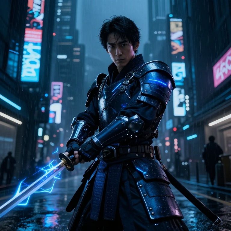 Kishida as a cyber samurai in a dystopian world, armored with glowing blue accents, holding a katana with electric energy, high tech urban background with dark tones, rain-soaked streets and holographic advertisements, dramatic and cinematic